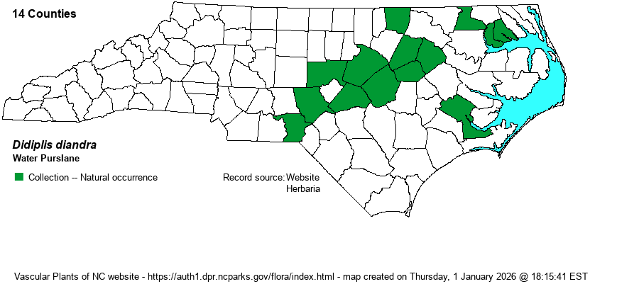 | Abundance | Seemingly rare, with a number of the county records being rather old, though not necessarily indicating a decline in the state, owing to it growing mostly submerged and easily overlooked. The NCNHP tracks records as a Significantly Rare species. Though they give an S1 State rank, owing to the few current records, the website editors think it is overlooked and suggest a rank of S2? | |