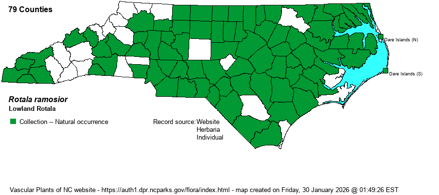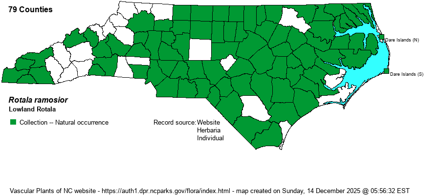 | Identification | This is a familiar lake and pond margin species, growing in colonies to about 1 foot tall on average, usually moderately branched. It is a glabrous species, with numerous pairs of opposite leaves, usually growing horizontally. Each leaf is narrowly lanceolate or oblanceolate, to narrowly elliptical, entire, about 1.5 inches long, with a tapering base and a rounded tip. The small flowers grow singly in the leaf axils. The calyx is rounded, almost globose, and the 4 petals are white but tiny. The two Ammannia species are somewhat similar, with numerous opposite, ladder-like leaf arrangements, but they have some or all leaves with auriculate bases, and larger flowers that are typically in small clusters in the axils (and not single as in Rotala). | |