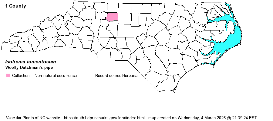 | Isotrema tomentosum | = | Aristolochia tomentosa | Gleason and Cronquist (1991) | | | Isotrema tomentosum | = | Aristolochia tomentosa | Fernald (1950) | | | Isotrema tomentosum | = | Aristolochia tomentosa | | | | Isotrema tomentosum | = | Aristolochia tomentosa | Flora of North America (1993b, 1997, 2000, 2002a, 2002b, 2003a, 2004b, 2005, 2006a, 2006b, 2006c, 2007a, 2009, 2010) | | | Isotrema tomentosum | = | Aristolochia tomentosa | Gleason (1952) | | | Isotrema tomentosum | = | Aristolochia tomentosa | Godfrey and Wooten (1979, 1981) | | | Isotrema tomentosum | = | Aristolochia tomentosa | | | | Isotrema tomentosum | = | Aristolochia tomentosa | Kartesz (1999) | | | Isotrema tomentosum | = | Aristolochia tomentosa | Radford, Ahles, and Bell (1968) | | | Isotrema tomentosum | = | Aristolochia tomentosa | Small (1933, 1938) | | | Isotrema tomentosum | = | Aristolochia tomentosa | Wunderlin & Hansen Flora of Florida (3) | | | Isotrema tomentosum | = | Isotrema tomentosa | | , orthographic variant | | Source: Weakley's Flora |