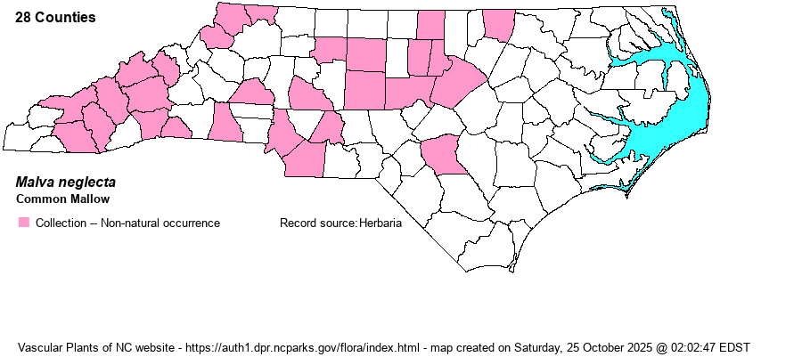 | Identification | Common Mallow is less than 2 feet long, often only a foot or less, and generally prostrate. The leaves are rounded in outline, vary shallowly 3-5 lobed (or barely discernable), the margins crisped/wrinkled with very fine short teeth. The flowers grow in leaf axils, 2-6 in a cluster, pale pink or lilac, the petals 9-13 mm long. The fruits look like little cheese wheels. | |