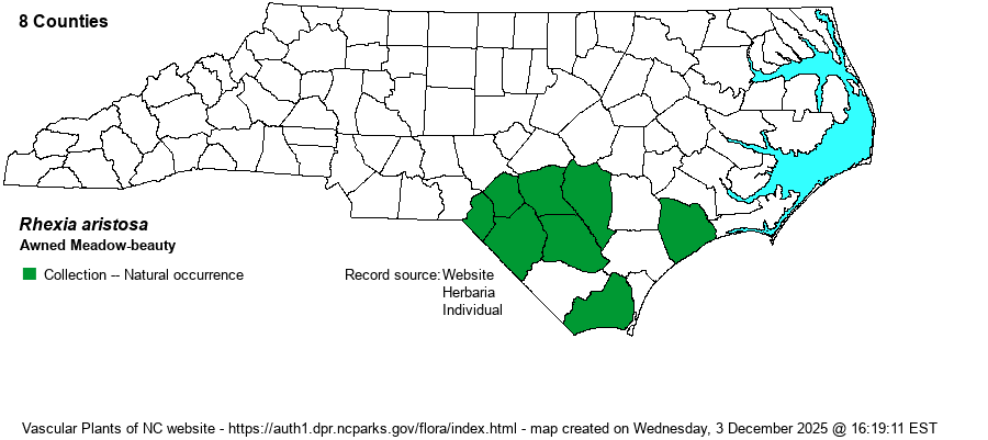 | Distribution | The southern third of the Coastal Plain, excluding the Sandhills proper; ranges north to Hoke, Cumberland, Sampson, and Onslow counties. SERNEC shows a few additional counties, but these are not likely to be correctly identified. Note that the species does occur in states to the north of NC.