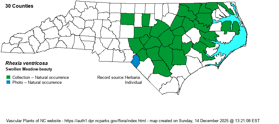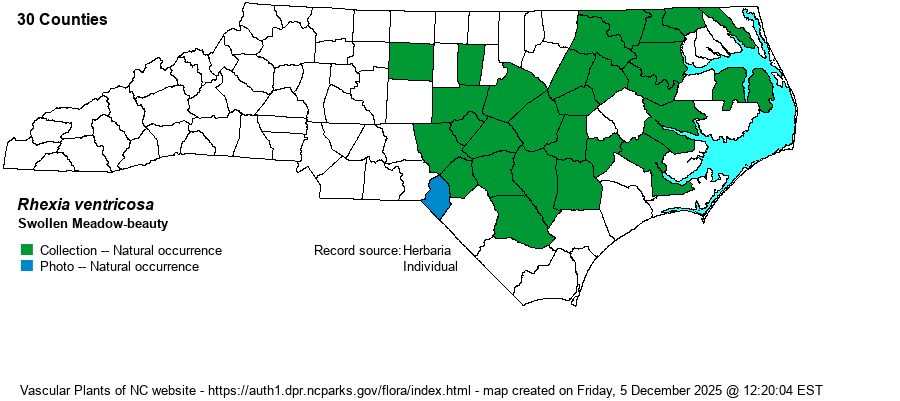 | Identification | This is a fairly standard Rhexia, quite hairy overall and typically with a few branches. It reaches about 2 feet tall, and has its mid-stem region consisting of 4 flat surfaces of equal size and flatness (compared with unequally flattened as in R. mariana and R. nashii). The paired leaves are elliptic to ovate, about 2-3 inches long and about 3/4-inch wide, with small serrations along the margins. The flowers are typical for the genus, consisting of a handful of them from upper leaf axils and stem tips, with the 4 petals being rose-pink to purple-rose and the flower being about 1.5 inches across. In this species, the edges of the stem are not winged, as in R. virginica. Also, R. virginica has the roots with tubes or spongy-thickened, versus none of these for R. ventricosa. Thus, separation of these two species can be troubling, and both can occur in the same regions and wetland habitats. In general, the petals of this species are not as deeply rose-colored as in R. virginica, generally more of a rose-pink color. | |
