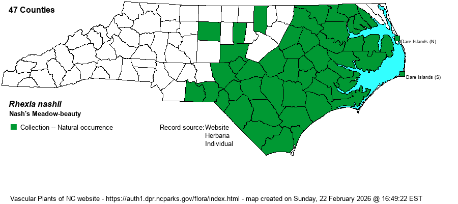 | Abundance | Common and widespread across the Coastal Plain, generally the most numerous Rhexia in that province. Very rare to rare into the eastern Piedmont. | |