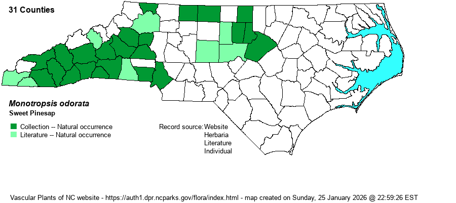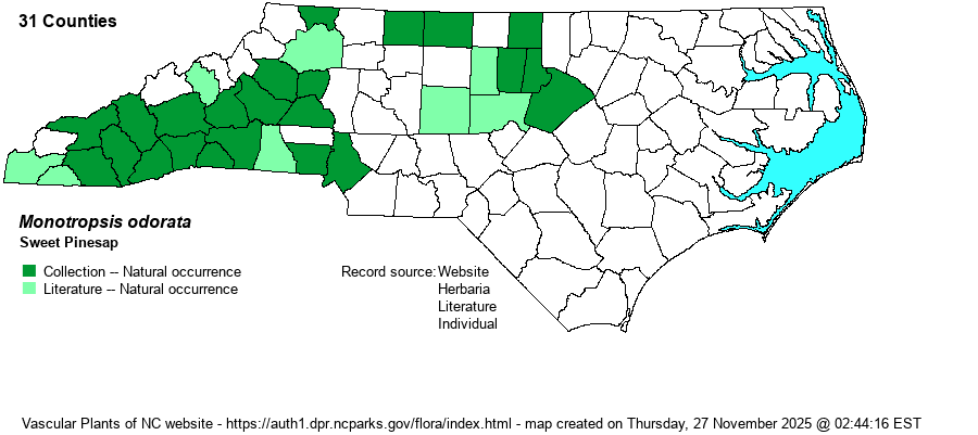 | Identification | As with its cousins in the genera Monotropa and Hypopitys, it is also saprophytic and lacks chlorophyll. However, this species is much shorter than them, with relatively larger flowers. The entire plant is often just 1.5-4 inches tall; plants emerging in late winter tend to be yellowish or tawny in color, with several drooping purplish flowers; the leaves are closely appressed to the stem, such that the entire plant is a tiny "seahorse" shape. Plants that emerge in fall are somewhat lavender in color, but still have purplish flowers. This tiny species is often covered by fallen leaves and can thus be hard to spot, but it has a distinctive fragrance that some people (but certainly not all) can detect just by their noses! Thankfully, as with the other saprophytic species named above, it almost always grows in very tight clusters of plants, often 5-25 plants growing in just a few square-inches. Finding the species, without locating a known colony, is a thrilling experience. However, oftentimes, the population you find will be one in fruit, being rather blackened and with the capsule erect, rather than drooping. | |