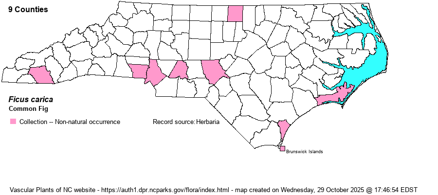 | Identification | Common Fig is widely grown in NC backyards, yet it rarely escapes. It is a small tree or spindly shrub up to 15 feet or so, with thick but weak stems and branches. Leaves are well-spaced, large, 3-5 lobed (sometimes none) like a glove, margins irregularly toothed. Flowers grow tight to leaf axils, with 2-6 sepals. Fruits are pear-shaped and many-seeded. | |