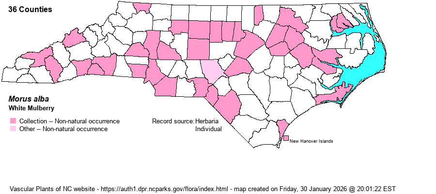 | Identification | White Mulberry recalls our native Red Mulberry (M. rubra), but mature leaves are much smaller (half the surface area or less) and are much more likely to have a lobe or "thumb." Blades are glabrate beneath vs. pubescent or puberulent beneath in Red Mulberry; they are also quite shiny above, as opposed to rather dull and not glossy above in that native species. Fruits are variable in color when mature, from whitish to blackish (vs. deep red-purple to blackish in Red Mulberry). | |