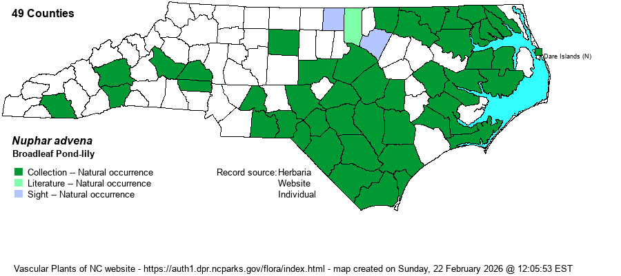 | Taxonomic Comments | This species has often been named as Nuphar lutea or Nuphar luteum. Many older references consider N. sagittifolia as a variety or subspecies of N. advena. See that species for more details.