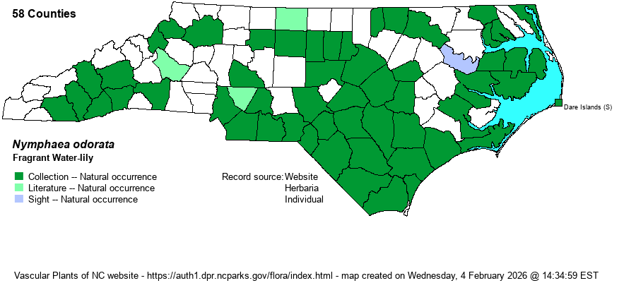 | Habitat | This species is widespread in a variety of still or sluggish waters, being found most often in lakes, ponds, impoundments, and beaver ponds; it is less often found on sluggish rivers and creeks than is Nuphar advena. As this is a popular ornamental plant, some locations in the state could certainly result from local introductions, but as it occurs across the eastern US, determination of which collections are natural versus ones that are not is near impossible. |