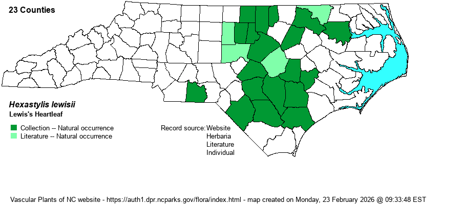 | Distribution | Present across a wide north-south band through the eastern Piedmont and western and southern Coastal Plain, though absent in the Sandhills proper. The population in Anson County occurs at Pee Dee NWR in a unique Wet Piedmont Flatwoods community, along with many Coastal Plain species.