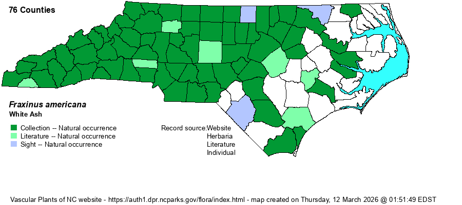 | Abundance | Common in the Mountains and Piedmont. Common along the western edge of the Coastal Plain, except absent in the Sandhills proper; uncommon in the central Coastal Plain, and rare to absent in the eastern portions. As the emerald ash borer is advancing southward into northern NC as of 2018, there has undoubtedly been a loss of some to many trees in the northern mountains and northern Piedmont, though the impact has been mainly to Green Ash (F. pennsylvanica). However, in 2022, NatureServe moved the Global Rank up from G5 to now G4; the NCNHP moved the State Rank from S5 to now S4S5 and added the species to its Watch List as W5 (strongly declining). | |