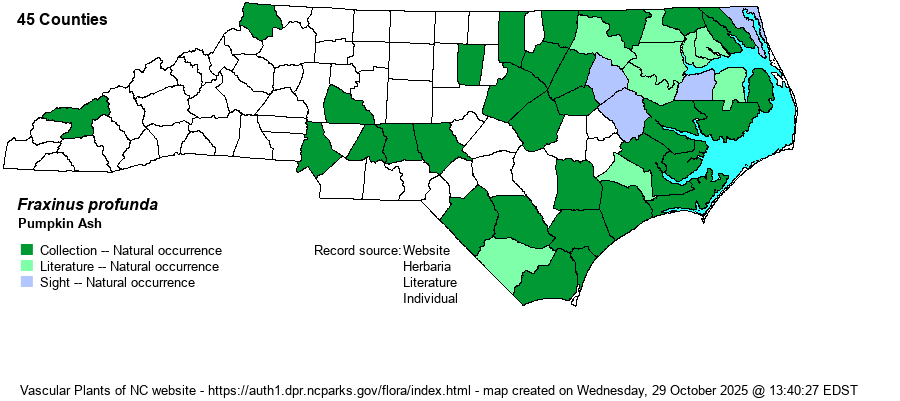 | Abundance | Generally uncommon to locally fairly common in the Coastal Plain, but is mysteriously rare to absent from some swampy regions where it ought to be present. Much less numerous than Carolina (F. caroliniana) and Green (F. pennsylvanica) ashes in wetlands in this province. Rare and local in the eastern Piedmont, and absent to very rare in the western half of the state. Though declines due to emerald ash borer have perhaps not been noted in this species yet, the NCNHP moved the State Rank from S4 to now S3S4 and placed it on its Watch List as W5 -- strongly declining. | |