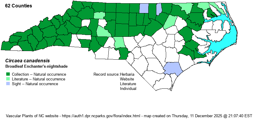 | Identification | This is a familiar species to biologists in the mountains and Piedmont, found in many a rich forest. It is an erect herb, mostly unbranched, growing to 1-1.5 feet tall. The several pairs of opposite leaves are at right angles to pairs above or below them, and each leaf has a moderate petiole, a widely ovate blade, with a truncate base and small serrations. The blades are 3-4 inches long and about 2 inches wide. Along the top several inches of the stem, as well as in one or two upper leaf axils, grows a slender raceme of quite small flowers. Each flower has only 2 parts each, with the 2 white petals (each one split into two lobes) creating a flower barely 1/5-inch across. The similar but smaller C. alpina grows mainly at elevations above this species, its leaves are cordate at the base, and have sharper teeth. Actually, in vegetative form, this species can be confused with the completely unrelated American Lopseed (Phryma leptostachya), and you may need to see a plant in bloom or fruit to be sure; each has paired ovate leaves with truncate bases, some serrations on the margins, and adjacent pairs of leaves at right angles. Lopseed has narrow, rather tubular flowers, and after blooming "lop" down to the stem. Also, both occur in rich hardwoods forests and have similar ranges! Circaea has tiny but quite exquisite flowers, but you need to get on hands and knees to study the 2-parted flower structure. | |