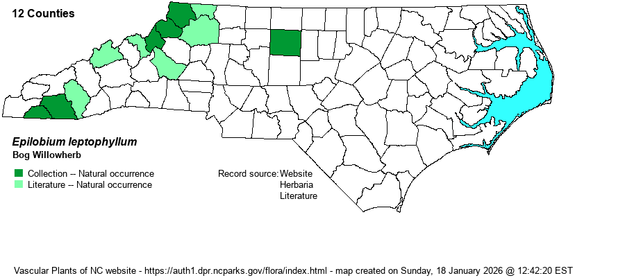 | Identification | This is an erect herb growing to about 2 feet tall, with numerous branches. It has narrower leaves than the other two Epilobium species, these being alternate and linear to very narrowly elliptic or oblong, about 2 inches long but barely 1/10-inch wide, with revolute and entire margins. Also, additional small (fascicled) leaves grows in the axils. The inflorescence is like the others in the genus, with numerous small white (rarely pink) flowers on long stalks from axils. This species should be easily separated from the others in the genus by the very narrow leaves; however, many or most sites are on private lands in bogs, so you will likely have trouble finding it in NC. | |