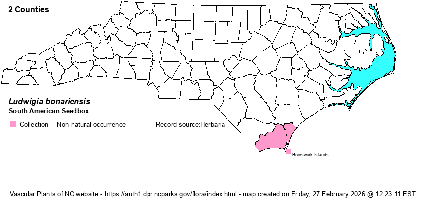| Identification | South American Seedbox grows 3-6 feet tall, the stems branched, and the narrow leaves alternate and pubescent. The flowers are solitary in axils, petals 1.5-3 cm long, yellow. It is much like L. octovalvis, but the petals are longer (1.5-3 cm vs. 1-2 cm in the native species) and the floral tube is the same length as the calyx segments (vs. markedly longer in the native L. octovalvis). Both of these species are essentially restricted in NC to the lower Cape Fear River area of New Hanover and Brunswick counties. Remember that the exotic species has huge flowers to about 2-3 inches across and a rather short floral tube, whereas the native one has medium-sized flowers about 1 1/2 inches across and a very long floral tube. | |