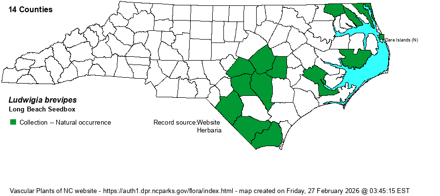 | Identification | This is one of just a few prostrate species of Ludwigia; however, as with nearly all members of the genus, the majority are not showy and attract little attention from biologists. This species grows along the ground or mud or in shallow water to about 1.5 feet long, with small and opposite leaves. These leaves are spatulate or oblanceolate, much wider near the apex than near the base, only about 3/4-1-inch long and much narrower. The other two prostrate Ludwigia -- the very common L. palustris and the scarce L. repens -- have flowers in axils that are sessile, whereas L. brevipes has its axillary flowers on pedicels about 1/5-1-inch long or more. This species may have petals or may not; if so, they are yellow and oblanceolate, and the flower is about 1/2-inch across, making the identification quite obvious. The sepals are triangular and about 1/3-inch long, with a sharp tip. If you see a creeping plant with spatulate leaves, take a close look. The other two species have leaves rather elliptical, but you really need to see flowers or capsules on stalks to be sure you have this scarce species. But, do not look for the yellow flowers, and petals may be absent, or may have easily dropped; look for the opposite, spatulate leaves. | |