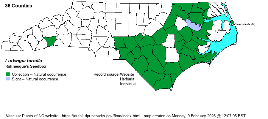 | Other Common Name(s) | Spindleroot. Nearly all websites use Spindleroot for the common name, but this is highly idiosyncratic, implying no relationship to other species. Weakley (2018), Sorrie (2011), and the Digital Atlas of the Virginia Flora website give Rafinesque's Seedbox as a common name, in order to use a common name with "Seedbox" as part of the name, as it is so clearly a seedbox, in every sense of the word. This website deviates from popular usage to provide a "better" common name, using the name of the author who described the species long ago. NatureServe's name of Hairy Ludwigia is poor in that L. pilosa is usually named as Hairy Seedbox. | |