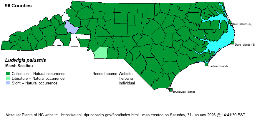 | Identification | This is one of three decumbent, creeping members of the genus in NC, the one that is very familiar to biologists, even if they do not bother with "belly-plants" growing on mudflats and shores. It grows to about 2 feet long, rooting at nodes, and has numerous pairs of opposite leaves. Each leaf is elliptical, entire, but only about 1-inch long and half as wide; the leaf blade is attenuated to the stem. From many leaf axils grow a single flower, essentially sessile, with no petals. The 4 sepals are light yellow, appearing "petal-like", and each one is ovate in shape, yielding a flower about 1/8-inch long, barely visible even when you bend down to see the plant close-up. In this species, the floral tube and capsule contains vertical dark green lines, which should help separate it from the quite similar but rare L. repens, which has no such dark green stripes on the capsule. L. brevipes, the other decumbent member of the genus, has narrower and spatulate leaves and the flower and capsule are on a definite stalk. L. palustris has a habit of growing in matted masses, and thus it can be tricky to see the leaf shape unless you spot a single stem. Nonetheless, in summer and fall, if and when you see a matted plant with small and elliptical, opposite leaves, growing on mud or other damp ground, there is a good chance you have found this species. For inexperienced people, you may need to see flowers and a capsule to be sure what you have. | |