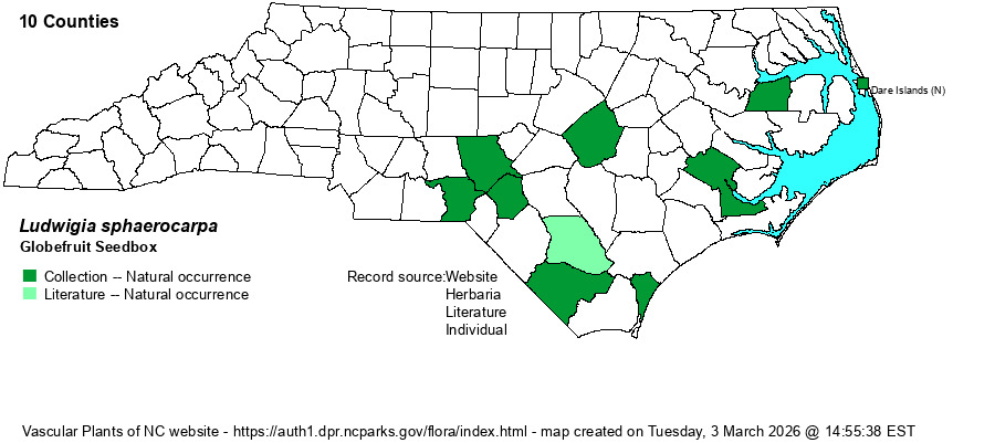 | Identification | This is a rather tall and erect species with some branches, somewhat resembling a few others in the genus. It has pubescent stems, scattered alternate leaves that are lanceolate like most others, being 2-3 inches long but only about 1/2-inch wide. The small flowers, with no petals, are tucked into leaf axils, but at least the sepals are colored -- pale yellow, and the spread flower is about 1/5-inch across. This species is generally identified by its capsules, which unlike any other Ludwigia is rather globose, rounded in shape and narrower at the base, being about 1/6-inch across. Other species have capsules that are cylindrical or cubical, or bell-shaped, but not as clearly globose as in this species. Thankfully, the pale color of the sepals against the green of the leaves will catch the attention of a biologist, especially for a plant growing in shallow water of a lake or pond shore or in a pool. As with many or most species of Ludwigia, there seems to be a feeling that few biologists are actively collecting or searching for them -- or many coastal marsh species -- and thus taking NCNHP records too literally for this group might make species appear to be much rarer than they are in life, especially as pool and ponded habitats are not really declining in the Coastal Plain. | |