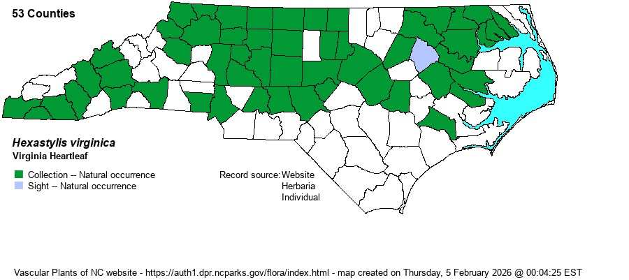 According to Weakley (2022), it ranges north to WV, and ranges south to southern NC, and west to eastern KY and northeastern TN. It is found in nearly all counties in VA and most of WV, and thus is clearly a more northern Hexastylis species, with NC at the southern end of the range. | |