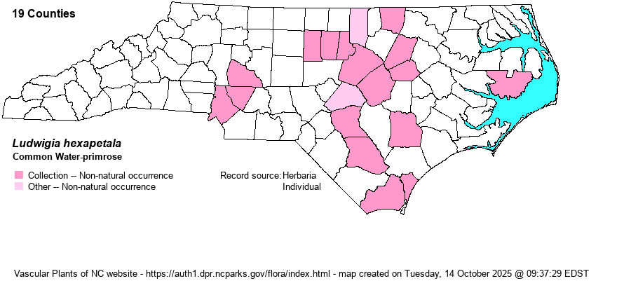 Identification | This is a large-flowered water-primrose. It is notable for the sparsely (sometimes densely) hirsute stems and branches. Leaves are variable, but generally wider than those of bonariensis. To tell from the former L. grandiflora, see key in Weakley (2018). In general, L. hexapetala has larger flowers -- to 2-2.5 inches across versus 1.5 inches across in the former L. grandiflora, and it has leaves widest toward to the tip (versus widest below the middle in that species). | |
