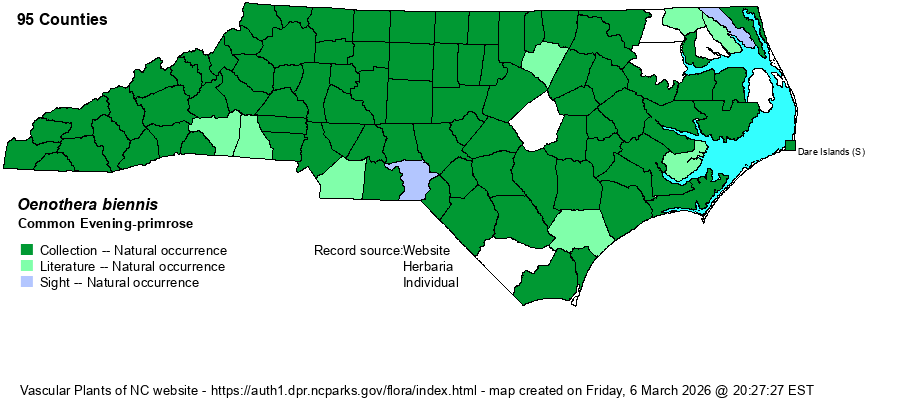 | Identification | This is an easily found species by biologists and the public, almost too common to become interested in it. It is a robust, very tall herb, growing to 5-6 feet tall, mostly unbranched or with a few small branches near the top of the stem. The very numerous alternate leaves are very long, about 6-8 inches long and 1-2 inches wide, lanceolate to narrowly elliptic, with serrated margins. The inflorescences are terminal on branch ends, with individual flowers from the axils of the uppermost leaves, on long floral tubes over 1-inch long. The 4 petals are pale to medium yellow (but not rich yellow), about 1.5 inches long but ascending, such that the flower is about 1.5-2 inches broad. Even without the flowers, this is normally an easily identified species owing to its tall stem, with the stem often dark red, and the abundance of alternate, long leaves. However, there are two other tall species present in the state that are very similar and have in the past been included within it. O. nutans and O. parviflora also occur in NC, mainly in the mountains. See the species accounts for these for some character differences. Generally speaking, these two have smooth/hairless inflorescences, versus pubescent in O. biennis, and O. parviflora has flowers only half the size of the other two. | |