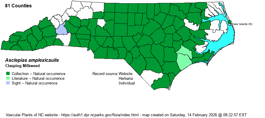 | Abundance | Fairly common to common in the Piedmont and most of the Coastal Plain, but very rare in the far northeastern Coastal Plain. Uncommon to frequent in the southern and central Mountains, but perhaps absent farther north. One of the more widespread milkweed species in the state, but a given population usually consists of 3 or fewer plants. | |