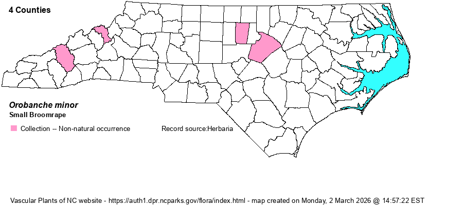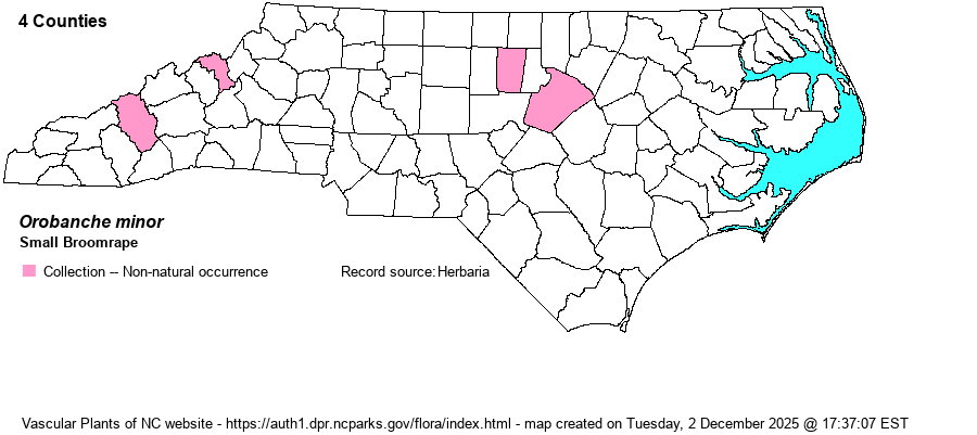 | Distribution | Collected from Haywood (1946), Mitchell (1993), and Orange (1918-1953) counties. RAB (1968) also map it in Wake County.