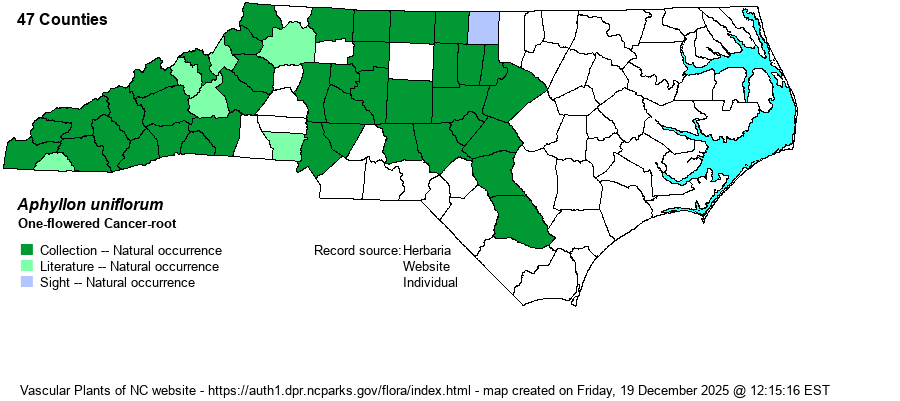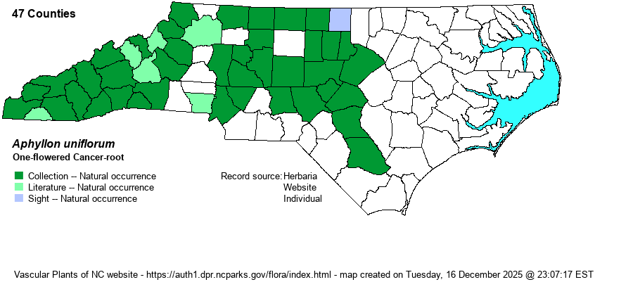 | Identification | This is a small and very easily overlooked species, and as it is a spring ephemeral species -- disappearing underground after fruiting by late May -- finding it can be difficult even though it isn't a rare species in the state. It is a root parasite with no chlorophyll, and thus is essentially white or cream-colored throughout, growing only to about 4-5 inches tall. A given plant can send up a few stalks, usually in small groups of plants, with the leaves being brown scales at the base of the stem. At the tip of the stem is the single white to pale lavender flower, with yellow in the throat; it is curved to face horizontally, with 5 spreading petals and looking a bit like a white violet, about 3/4-inch across. Though the plants are small, thankfully for the observer the entire plant is whitish, quite like an Indian-pipe (Monotropa uniflora) at first glance. Thus, on a spring walk along the base of a rich slope, or along a wooded stream bank, keep your eyes open for these "white pipes". Though there is no assurance that the species has declined in the past 60 years, it can hardly be called a "frequent" species nowadays in much or most of the Piedmont, and it is always a notable day when you stumble onto the species. | |