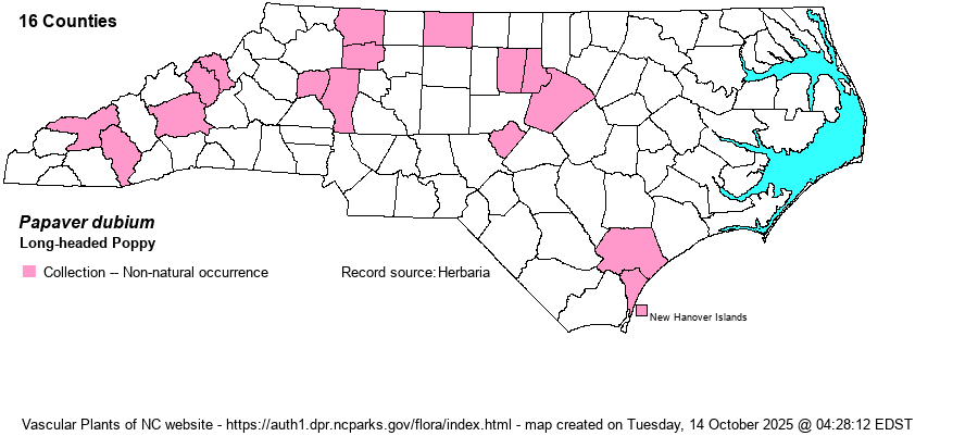 Distribution | Mostly the Piedmont and Mountains; also New Hanover and Pender counties. Some records lack label data, so the website editors cannot tell if cultivated.