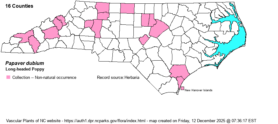 | Distribution | Mostly the Piedmont and Mountains; also New Hanover and Pender counties. Some records lack label data, so the website editors cannot tell if cultivated.