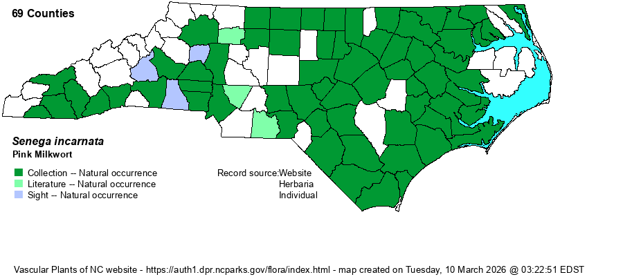 | Abundance | Though it has been recorded from over 65 counties, it is not a common species in NC, at least as compared with some other Senega species like S. mariana and S. curtissii. It is fairly common in most of the Coastal Plain and the eastern Piedmont, infrequent in the central and western Piedmont, and uncommon in the southern Mountains. Despite it not being truly common anywhere, the website editors feel that its overall range in the state merits a State Rank of S5 instead of S4. | |