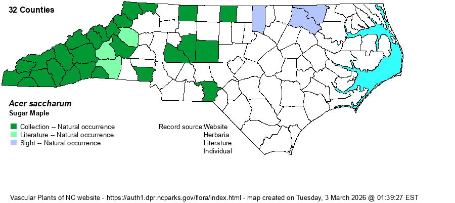 | Abundance | Common and widespread in the Mountains, except in low elevations, where fairly common to common. Rare and somewhat poorly known in the Piedmont, where likely overlooked as Florida Maple (A. floridanum). Some Piedmont records likely relate to escaped individuals/populations. | |