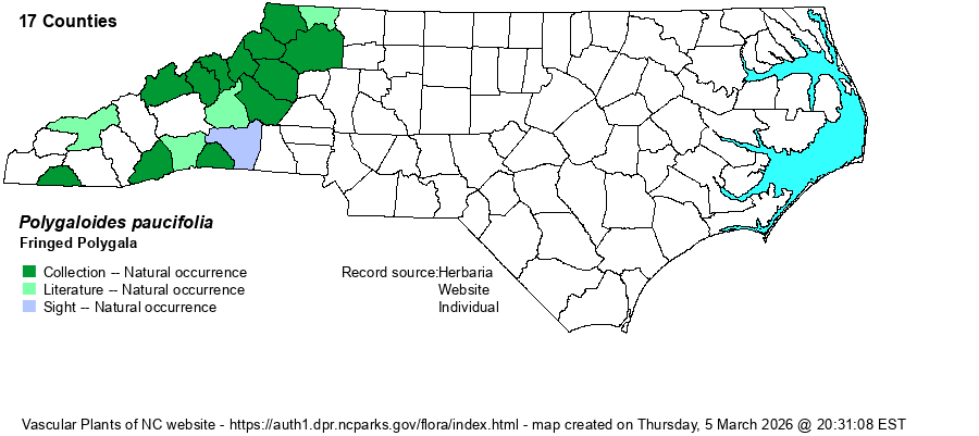 | Distribution | Present over most of the northern Mountains, south to Yancey and Burke counties; but scarce and local in the southern Mountains. Oddly lacking specimens from heavily worked Buncombe County, as well as fairly well studied Haywood, Swain, Macon, and Jackson counties. There are a good handful of iNaturalist photos of this species from counties where not documented by collections; a few have been included here, but not all, as it is very difficult to know if any of these refer to planted populations.