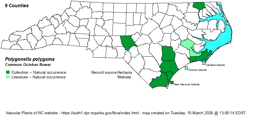 | Polygonella polygama | = | Polygonella polygama var. polygama | Flora of North America (1993b, 1997, 2000, 2002a, 2002b, 2003a, 2004b, 2005, 2006a, 2006b, 2006c, 2007a, 2009, 2010) | | | Polygonella polygama | = | Polygonella polygama var. polygama | Ronse Decraene, Hong, & Smets (2004) Brandbyge in Kubitzki, Rohwer, & Bittrich (1993). Key adapted from FNA and other sources. | | | Polygonella polygama | = | Polygonella polygama var. polygama | Ronse Decraene, Hong, & Smets (2004) Brandbyge in Kubitzki, Rohwer, & Bittrich (1993). Key adapted from FNA and other sources. | | | Polygonella polygama | = | Polygonella polygama var. polygama | Flora of Virginia | | | Polygonella polygama | = | Polygonella polygama var. polygama | Wunderlin & Hansen Flora of Florida (3) | | | Polygonella polygama | < | Polygonella polygama | Gleason and Cronquist (1991) | | | Polygonella polygama | < | Polygonella polygama | Fernald (1950) | | | Polygonella polygama | < | Polygonella polygama | Gleason (1952) | | | Polygonella polygama | < | Polygonella polygama | | | | Polygonella polygama | < | Polygonella polygama | Radford, Ahles, and Bell (1968) | | | Polygonella polygama | < | Polygonella polygama | Ronse Decraene, Hong, & Smets (2004) Brandbyge in Kubitzki, Rohwer, & Bittrich (1993). Key adapted from FNA and other sources. | | | Polygonella polygama | = | Polygonum polygamum var. polygamum | | | | Polygonella polygama | = | Polygonum polygamum var. polygamum | Ronse Decraene, Hong, & Smets (2004) Brandbyge in Kubitzki, Rohwer, & Bittrich (1993). Key adapted from FNA and other sources. | | | Source: Weakley's Flora |