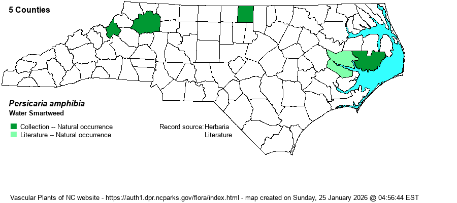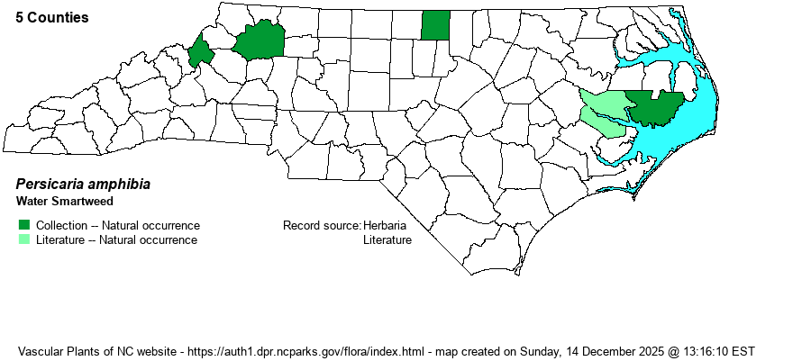 | Taxonomic Comments | Named as Polygonum coccineum in RAB (1968) and some other references. The taxonomy of the Persicaria amphibia -- P. coccinea pair is far from settled. The former (in the strict sense) is thought to be native to Eurasia, according to FNA, and found in the New World only in New Brunswick and New York; the latter is native to the Americas. Weakley (2020), following Haines (2011, Flora Novae Angliae) recognizes P. amphibia ssp. laevimarginata and P. coccinea as both occurring in North America and both native there and both rather widespread. Alternatively, FNA discusses the differences between the 2 "species", as well as chracters noted in aquatic plants and semi-terrestrial plants, both of which have been given varietal or subspecific names. FNA lumps everything into a broadly viewed P. amphibia. The arguments of FNA and Haines cry out for modern molecular study. Meanwhile, BioDiv Taxon Editors will treat all NC material as P. amphibia, except where NCU specifically lists P. coccinea (as it also has specimens labelled as P. amphibia).