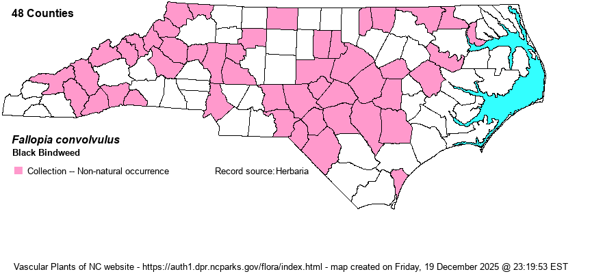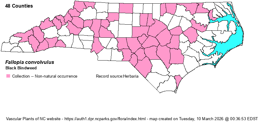 | Identification | Black Bindweed is an annual, slender, climbing vine that may reach 3 feet long. The leaves are well-spaced, ovate, taper-tipped, and cordate at the base (or hastate at base with backward pointing lobes). The small flowers grow in leaf axils on short to lengthy stalks, greeniush white and often tinged pink. From our native species of Fallopia, it is told mainly by its dull black seeds (vs. glossy black seeds). | |