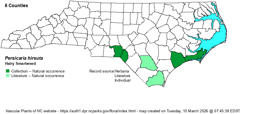 | Identification | The generally densely, shaggy-hairy stems are unlike any of our other smartweeds. Stems may be erect, but often lazy and recline. They may poke up through shallow water, but do best when stranded. The leaves are narrow and mostly lanceolate; and the spike-like inflorescences are white to pale pink, rather densely-flowered. Even without flowers, this great rarity in NC is easily identified just by its densely hairy stems. As it occurs in bays and closed pools, it can occur with a few other rare wetland species. | |