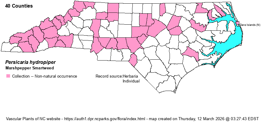 | Identification | This species is often confounded with the native P. hydropiperoides, not only because the names are similar, but physically they are similar. In NC, the great majority of P. hydropiperoides individuals have narrower and longer leaves than P. hydropiper, and the flowers are not punctate. It is very similar to P. punctata, but that species has shiny and smooth seeds (vs. dull and minutely roughened in these two species). | |