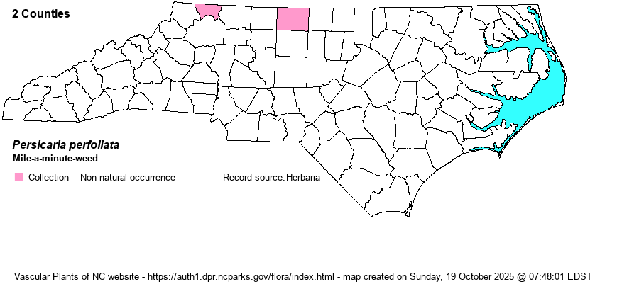 Abundance | Very rare. However, one population in Alleghany County had 1000+ plants in 2010. This aggressive alien has been declared a noxious weed in a few states, and it is important that all NC occurrences be eradicated. | |
