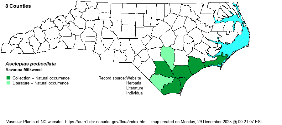 | Abundance | Generally rare over its range in the state, but uncommon in a few well-managed natural areas in coastal counties. It is listed as State Special Concern. Despite it being state-listed, there are enough records in the NCNHP database for it to be State Ranked as S3 instead of S2, further indicating that it is not rare in a handful of sites toward the coast. | |