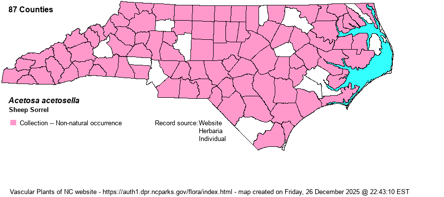 | Distribution | This species had its genus name changed in Weakley (2023); it was formerly Rumex acetosella. Throughout the state; likely in every county.