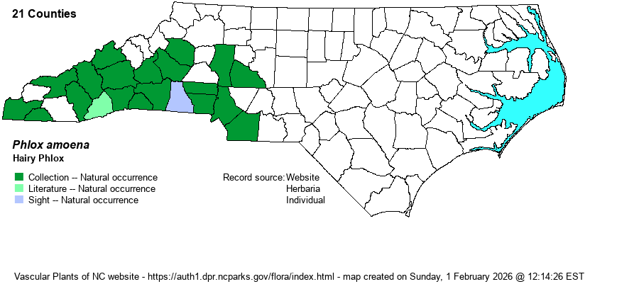 | Identification | This is one of the shorter species in the genus, generally reaching only about 8 inches tall, with erect to somewhat leaning stems. There may be a few stems from a common base, or a few short branches; the species often grows in dense clumps where it can be hard to count plants. This is a somewhat hairy species on the stems and leaves. There are only a few pairs of opposite leaves on each stem, the blades being narrowly elliptic to oblong to almost linear, only about 1-inch long and barely 1/6-inch wide, generally sessile, mainly ascending, and with entire margins. From the tips of the branches and stems are a few rose-colored flowers, each with a long and narrow tube and 5 flaring lobes (as in most species in the genus). Each flower is about 3/4-inch across. As with most other Phlox species, the key in identifying species is usually by leaf characters. This is not hard to find in dry wooded margins in some of the counties along the SC state line near the Blue Ridge Escarpment; when driving along wooded roads, keep an eye out for rose-pink flowers on low-growing plants. | |