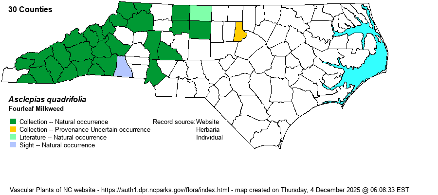 | Abundance | Fairly common in the Mountains, though much less numerous there than the other mostly montane species -- Poke Milkweed (A. exaltata). It is rare to uncommon in the western Piedmont, where clearly declining in recent decades -- at least along the eastern part of the range. | |