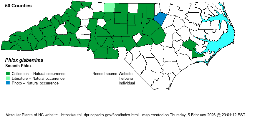 | Identification | This is a widespread Phlox, generally familiar to most biologists, but it does not normally grow in large stands, unlike what P. carolina may do. It has an erect stem growing to 2-3 feet tall, strictly glabrous. It has 7-15 nodes, of opposite leaves, beneath the inflorescence. Each leaf is narrowly lanceolate, about 3-4 inches long and only about 2/5-inch wide, with entire margins; leaves of P. carolina are similar but are usually somewhat wider. In this species, the flower cluster -- a panicle of cymes -- is somewhat flat-topped to slightly rounded, often twice as wide as tall. The cluster of P. carolina is more dense and rounded, about like a baseball in size and shape, about as tall as wide, if not taller. The numerous rose-pink flowers in the cluster are standard for the genus, with a long tube and 5 flaring lobes, the flower nearly 1-inch long and about 4/5-inch wide. There are calyx details that may help separate the species from others; in P. carolina the calyx, including the lobes, are 9-12 mm long, versus 5-8 mm in P. glaberrima. Also, in P. carolina the calyx is subcylindric (tubular), the membranes weak, and the sepals are fairly broad and with a rather weak midrib; versus calyx subcampanulate (rather rounded to cup-like), the membranes firm, and the sepals narrow with a well-developed midrib in P. glaberrima. Generally, the inflorescence of P. glaberrima is flattened and generally wider than tall, whereas P. carolina has a rounded cluster. P. maculata has a tall but narrow inflorescence, quite cylindrical in shape, and it has distinctly red-spotted stems. | |