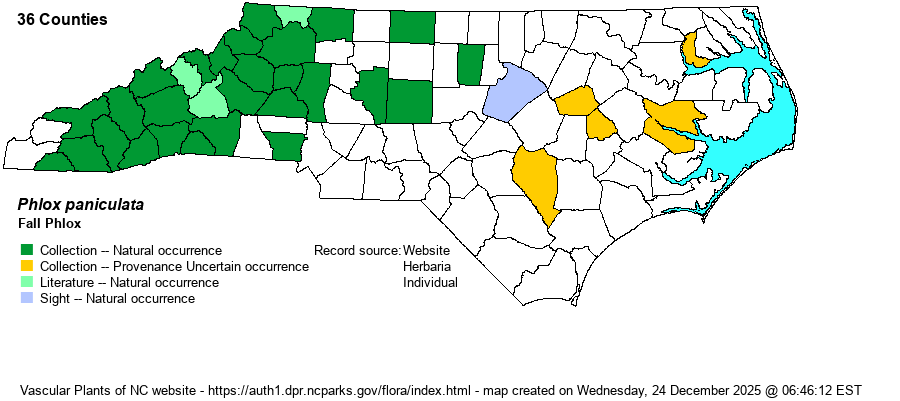 | Abundance | Fairly common in the Mountains; rare to uncommon in the western third of the Piedmont, but very rare into the eastern portions (to Orange and Wake counties). Might not be native as far east as Orange and Wake counties, and probably is not native to the Coastal Plain. | |