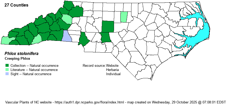 | Abundance | Fairly common to locally common in the Mountains, rare and local in the Piedmont portion of the range. As this plant is stoloniferous, where it occurs it may grow in sizable stands. | |