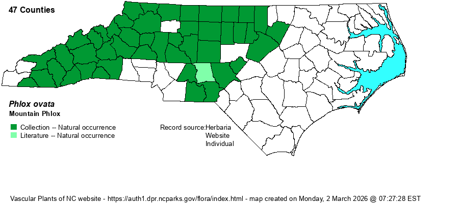| Identification | This is an erect, or decumbent at the base and then becoming erect, herb ranging to only about 1-1.5 feet tall. It has only about 3-4 nodes below the inflorescence, with the opposite leaves being mainly ovate to lanceolate, about 3 inches long and 1-inch wide. The flower cluster at the top of the stem is moderately rounded and a few inches high and across. The rose-pink flowers are similar to others, being tubular with 5 flared lobes, with the flower about 1-inch across. This species should be easily identified by its combination of rose-pink flowers and only 3-4 sets of opposite leaves; P. divaricata also has very few paired leaves, but the flowers are lavender-blue and usually has narrower leaves. As with a number of other Phlox species, these are quite conspicuous when in bloom, and the group seems to have been actively collected over the decades, such that range maps are mostly well-fleshed out and making each one of them seemingly quite common on the landscape, when in fact they are not truly common. | |