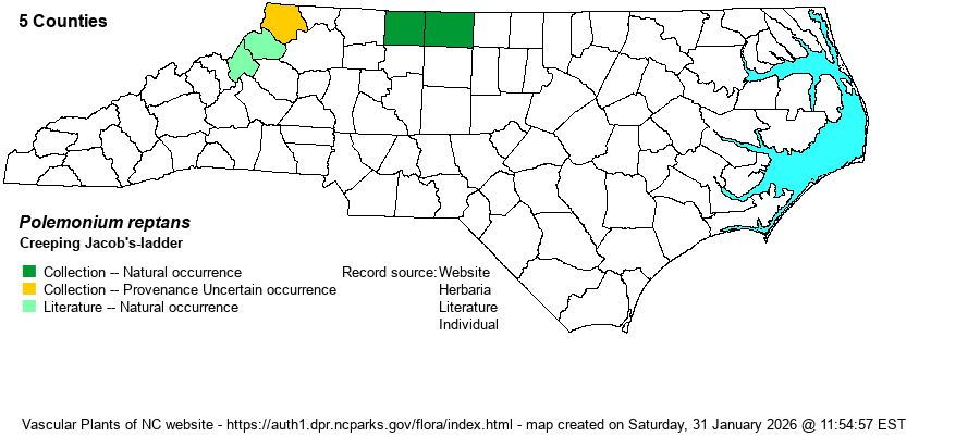 | Other Common Name(s) | Spreading Jacob's-ladder, Jacob's-ladder, Greek-valerian. There are numerous species of Polemonium in North America, and the general group name is "Jacob's-ladder". Though some references use the idiosyncratic name of Greek-valerian, it is best to go with a name used by some references as "xxxxxx Jacob's-ladder", and it seems a toss-up between Creeping Jacob's-ladder and Spreading Jacob's-ladder. The word "reptans" in Latin means "creeping", and thus the editors are using this first name. | |