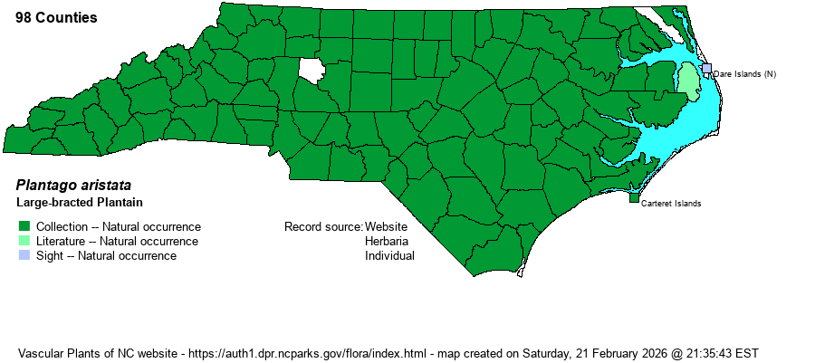 This is a widespread species, ranging across most of the country, except for a few Western states. Some references claim that this is a non-native species in the eastern U.S., but many do consider it as a native. Weakley (2024) considers it of uncertain provenance in the Atlantic Coast states, but indicating that it certainly is native at least east to OH and MS. For now, the website editors will keep it as a native species, with counties coded in green for Natural Occurrence, rather than orange for Provenance Uncertain. | |