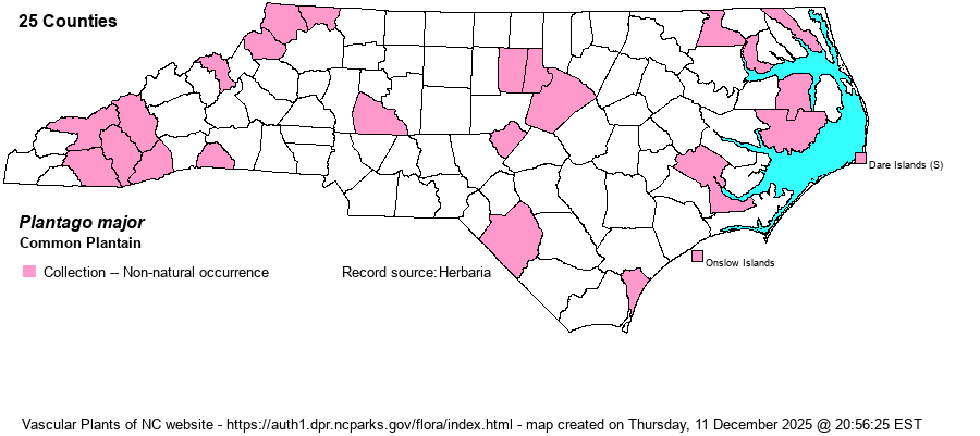 | Identification | This species is typical of most plantains -- a basal rosette or group of leaves plus 1-many scapes with one flowering head per scape. In this species, the leaves are usually very broadly elliptic or ovate, with impressed ribs, and the leafstalk is entirely green or dusky. The heads are linear and long. It is very similar to the native and quite numerous P. rugelii in most respects, but that species has dull red leafstalks (as opposed to green). | |